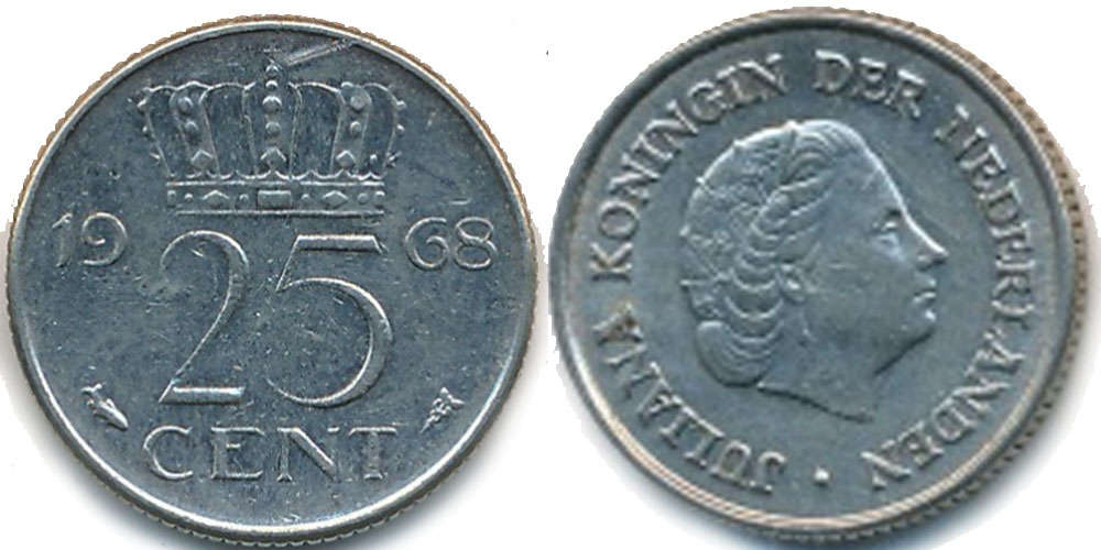Монеты » Монеты Европы » Монеты Нидерландов » 25 центов 1968 Нидерланды